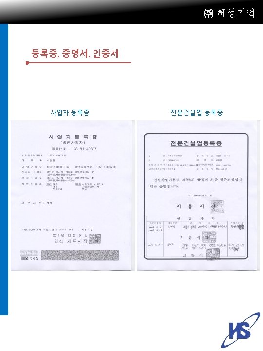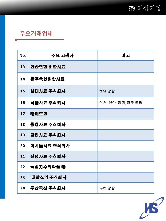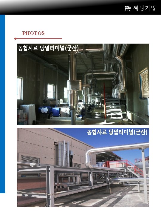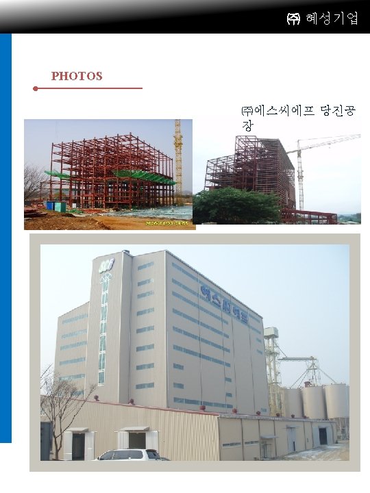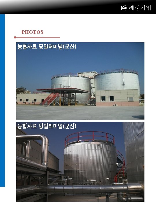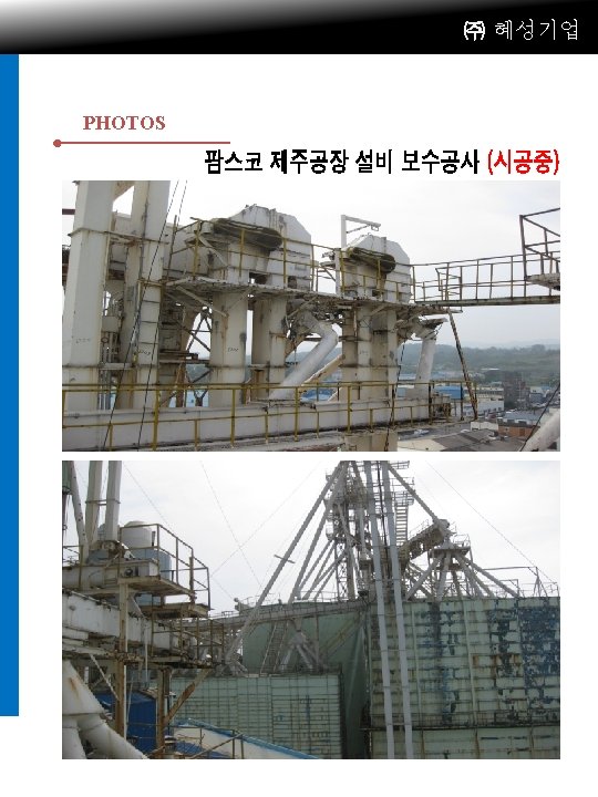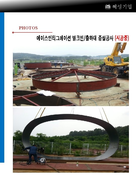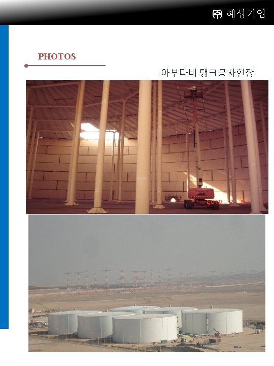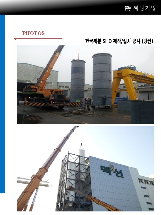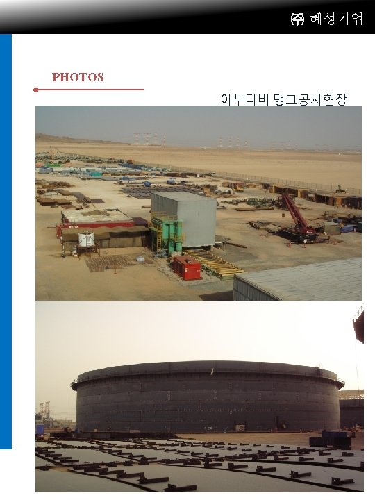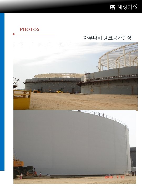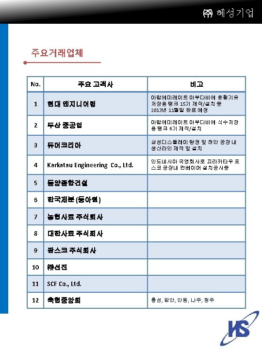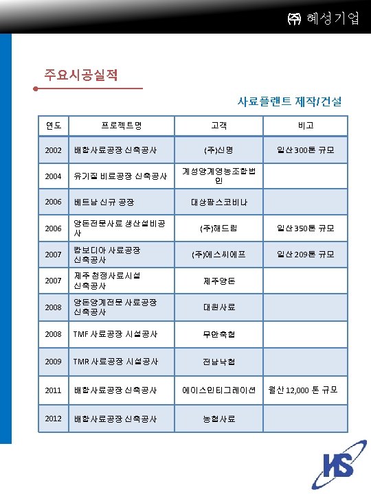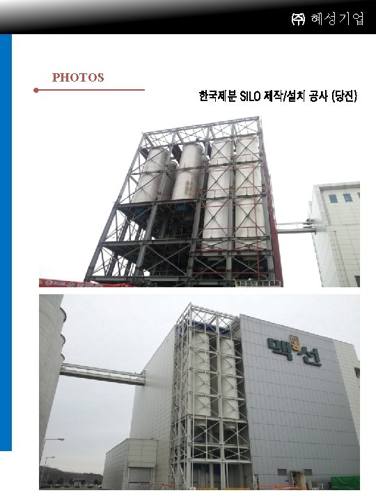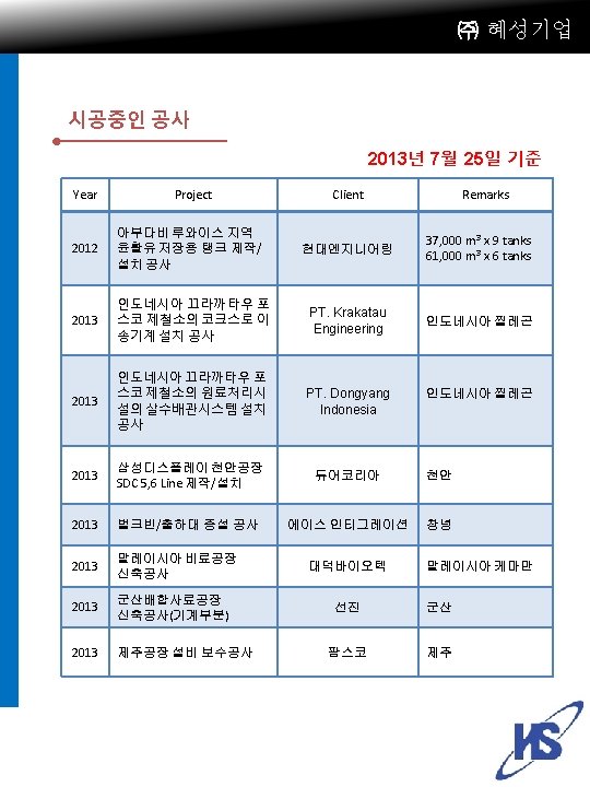 ㈜ 혜성기업 주요시공실적 탱크, 사일로 및 철구조물 제작/건 설 연도 프로젝트명 고객 비고 Doosan Heavy Industries & Construction 89, 627 m³ Potable Water Storage Tank (6 units) 2009 PWS Tank Fabrication/Erection, Shuweihat S 2 Desalination Plant -Abu Dhabi, U. A. E 2012 Field Fabricated Tanks, LBO Production Facilities Project Al Ruwais Refinery Plant, Abu Dhabi, U. A. E Hyundai Engineering Co. , Ltd. 37, 000 m³ x 9 tanks 61, 000 m³ x 6 tanks 2012 Molasses Terminal Construction in Kunsan, Korea Nonghyup Feed Co. , Ltd. Molasses Storage Tanks (2 units) and Piping Fabrication/Erection 2012 Flour Mills Silo Fabrication/Erection in Dangjin, Korea Donga One Corporation 2013 Samsung Display’s Tangjeong Factory T 8 Line Manufacture Durr Korea Co. , Ltd. Tangjeong, Korea 2013 Samsung Display’s Cheonan Factory SDC 5, 6 Line Manufacture/Installation Durr Korea Co. , Ltd. Cheonan, Korea