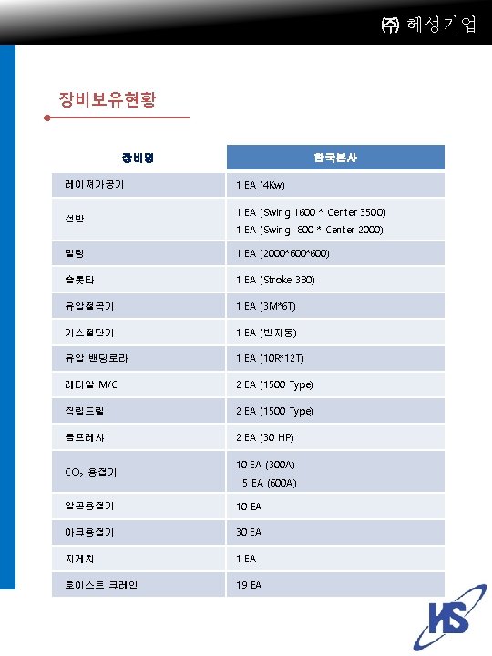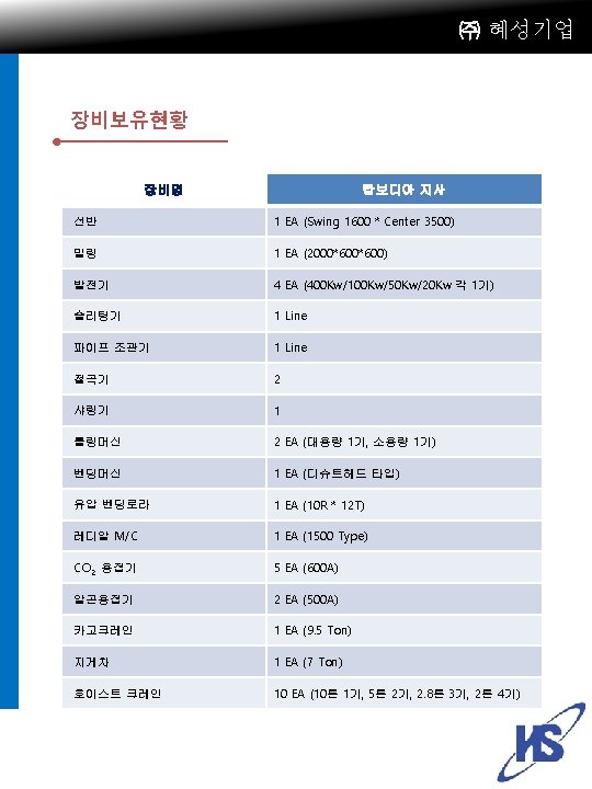 ㈜ 혜성기업 장비보유현황 장비명 중동 현장 Auto Welding Machine 8 EA (Vertical) Auto Welding Machine 26 EA (Horizontal) Auto Welding Machine 8 EA (Bottom) Welding Machine 6 EA (Submerged Arc) Welding Machine 220 EA (Arc) Welding Machine 82 EA (CO 2) Welding Machine 18 EA (Tig) Automatic Gas Cutter 46 EA Gouging Cutter 16 EA Welding Dry Oven 8 EA Portable Welding Dryer 100 EA Electric Grinder 290 EA Chain Block 258 EA Level Block 140 EA Hydro Jack 8 EA Compressor 12 EA Bending Machine 4 EA Generator 14 EA (400 Kw ETC)