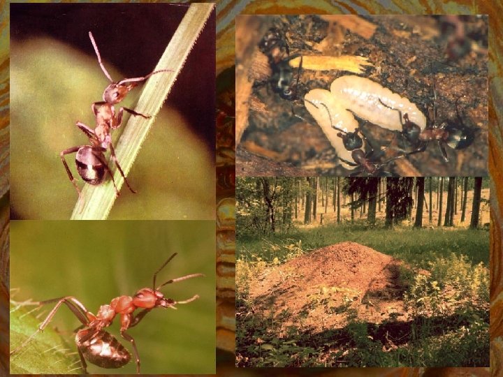 Formica rufa – erdei vöröshangya, 9 -11 mm, a dolgozó 4 -9 mm királynő, hím, dolgozó bütyök az 1. potrohszelvényen mono- és polygyn államok boly alapítása: megtermékenyített nőstény néhány dolgozóval elvonul vagy: egyedül elfoglalja egy idegen faj (pl. F. fusca) fészkét: megöli a kirlynőt és petézni kezd