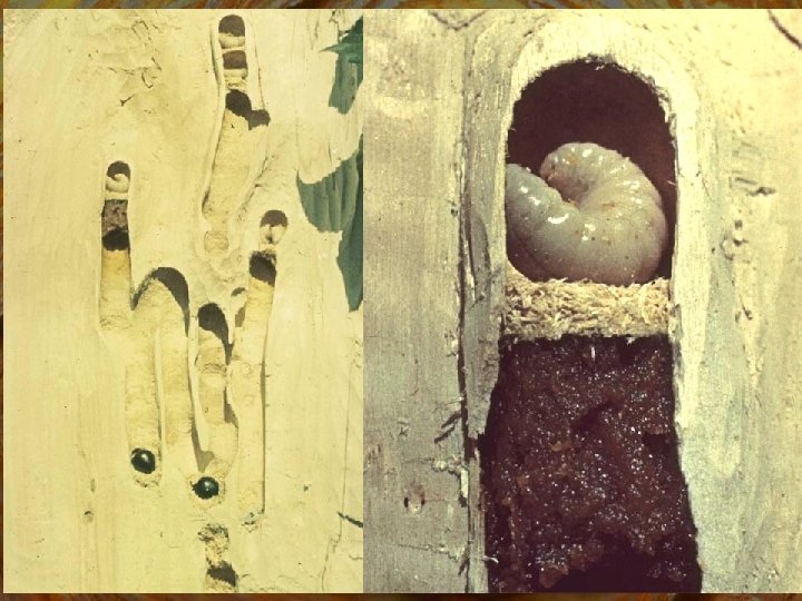 Megachilidae - művészméhek fészek kivágott levéllemezdarabokkal bélelve, benne virágpor és a fejlődő lárva Megachile centuncularis rózsaméh