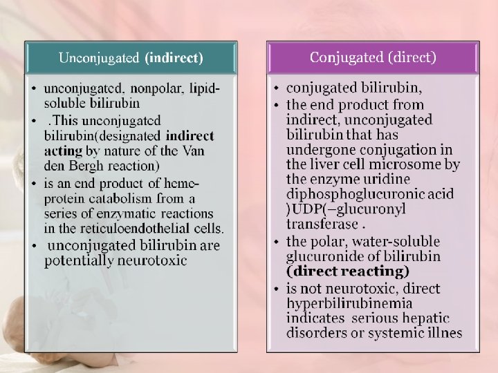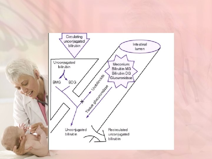• Delay in passage of meconium, which contains 1 mg bilirubin /d. L, may contribute to jaundice by enterohepatic circulation after deconjugation by intestinal glucuronidase ) • Drugs such as oxytocin and chemicals used in the nursery such as phenolic detergents may also produce unconjugated hyperbilirubinemia