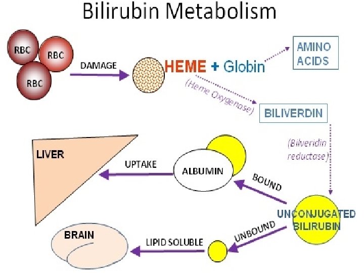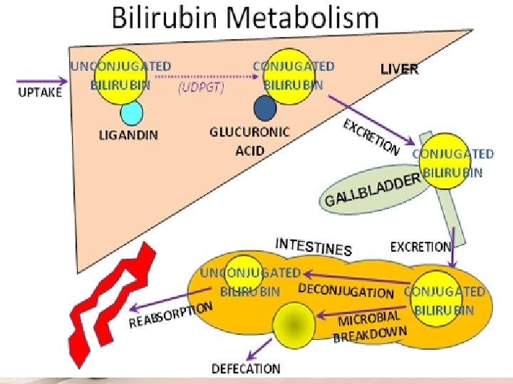 HB heme globin iron biliverdin Unconjugated bilirubin albumin 2 Glocoronic acid UDPGT Bilirubin diglocoronide urobilinogen stercobilin Absorbed back to liver by E. H circulation Reabsorbed to blood