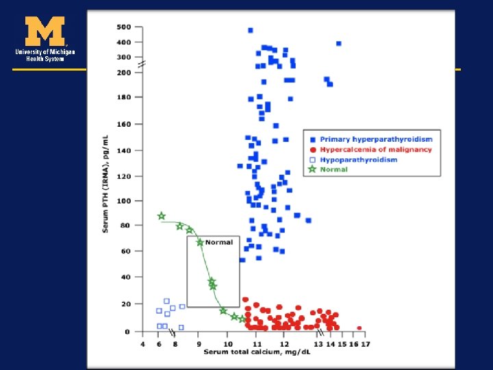 Approaching the diagnosis High/Norma l Medications � PTH Vit D Toxicity > 10. 3 mg% I-PTH Low Milk-Alkali Cancers/ Lymphoma Low PTHr. P