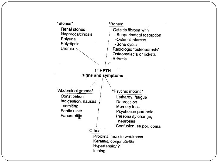 Hypercalcemia of Malignancy Specific causes of hypercalcemia Direct invasion of bone (local osteolysis)-20 -40% Tumor production of circulating factors (PTHr. P) that osteoclastic resorption of bone (humoral hypercalcemia of malignancy)-40 -50% Ectopic production of 1, 25 (OH)2 D 3 (lymphomas) Ectopic production of PTH (Lung, Ovary, Thyroid) Concomitant malignancy and PHP or granulomatous disease Treatment with estrogen and antiestrogen (tamoxifen)