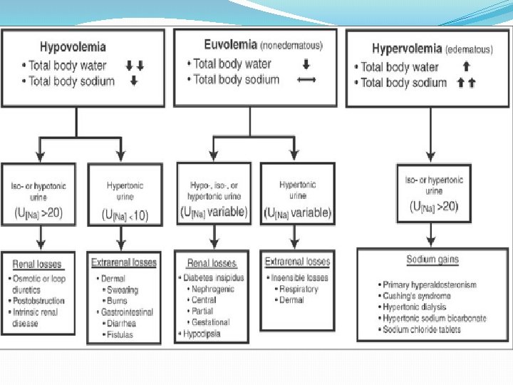 Water loss �Pure water loss �Decreased intake (elderly, unconscious) �Excessive loss (decreased AVP secretion diabetes inspidus, nephrogenic) �Water and sodium loss �Water loss exceeds sodium loss �Osmotic diuresis (DM, excessive sweating or diarrhoea)