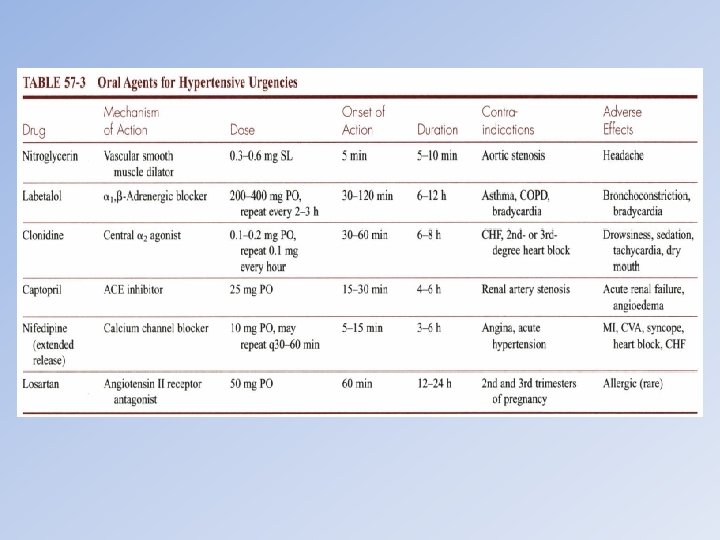 The relative frequency of end-organ involvement in hypertensive emergency End-organ damage type • • Cases (%) Cerebral infarction 24. 5 Intracerebral or subarachnoid bleed 4. 5 Hypertensive encephalopathy 16. 3 Acute pulmonary edema 22. 5 Acute congestive heart failure 14. 3 Acute myocardial infarction or unstable angina 12. 0 Aortic dissection 2. 0 Eclampasia 2. 0 Data from Zampaglione B, Pascale C, Marchisio M, et al. Hypertensive urgencies and emergencies. Prevalence and clinical presentation. Hypertension 1996; 27: 144– 7.