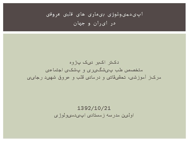 ﺗﻌﺮیﻒ ﺑیﻤﺎﺭیﻬﺎی ﻗﻠﺒی ﻋﺮﻭﻗی - ﺑﺮﺍﺳﺎﺱ یکی ﺍﺯ گﺰﺍﺭﺷﻬﺎی ﺳﺎﺯﻣﺎﻥ ﺑﻬﺪﺍﺷﺖ ﺟﻬﺎﻧی ﺑیﻤﺎﺭی ﻫﺎی ﻗﻠﺒی : ﻻﺕ ﺯیﺮﺍﺳﺖ ﻼ ﺷﺎﻣﻞ ﻣﺠﻤﻮﻋﻪ ﺍﺧﺘ • Hypertension (high blood pressure) • Coronary heart disease (heart attack) • Cerebrovascular disease (stroke) • Peripheral vascular disease • Heart failure • Rheumatic heart disease • Congenital heart disease • Cardiomyopathies • Deep vein thrombosis and pulmonary embolism