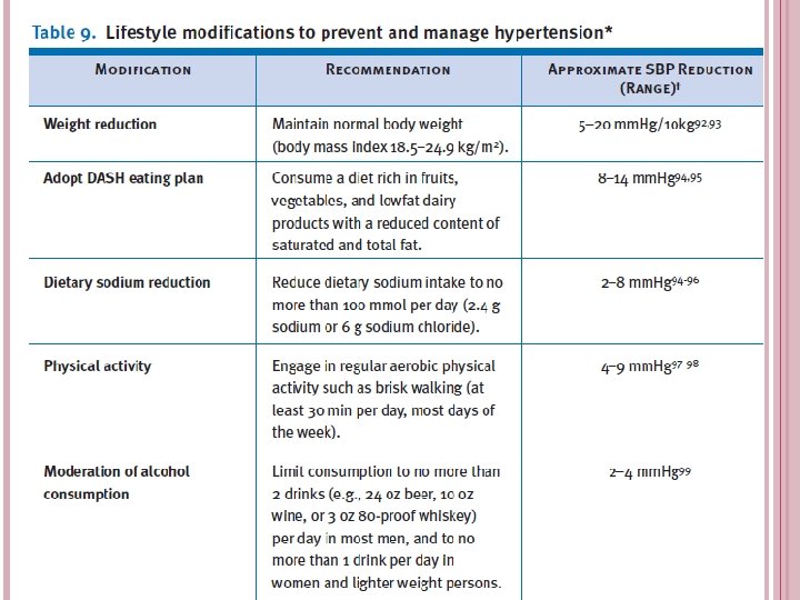 A) POPULATION STRATEGY 1. Nutrition Salt intake Less than 2. 4 gm sodium or 6 gm Na. Cl Moderate Restrict 2 fat intake alcohol intake drinks /day for men 1 drink/day for women