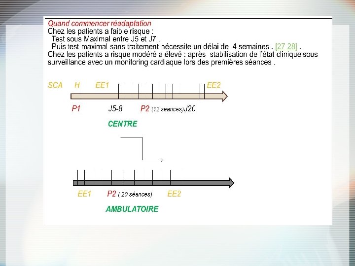 Contre indications SCA non stabilisé Insuffisance cardiaque décompensée Troubles du rythme non maîtrisé Thrombus intracardiaque instable Épanchement péricardique significatif MTE récente Obstacle à l'éjection ventriculaire Affection inflammatoire ou infectieuse évolutive HTAP sévère Incapacité à réaliser des exercices physiques