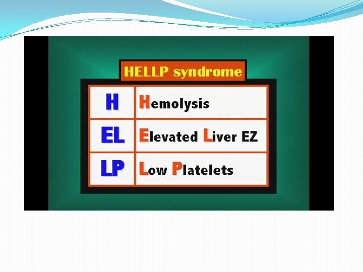 �V. HELLP SYNDROME �Severe form with rapid deterioration. �Active aggressive management regardless of gestation age. • Management: • Prevention : ANC • Aspirin • Diet • BP control in HTN patients