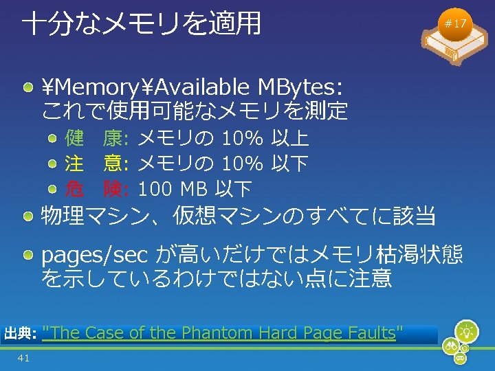 メモリのキャパシティ プランニング メモリがより多くあれば、よく使用される データがメモリにより多く滞在し、 ページングがより少ない頻度に "MemoryCommitted Bytes" をメモリの キャパシティ プランニングを行う際に参考にする 親パーティション (物理ホスト) Root Partition– 16 GBs メモリ (physical host) 仮想ゲスト RAM: 2 GBs Committed Memory Pagefile. sys 42 Committed Memory RAM: 4 GBs Committed Memory 親パーティション Root (物理ホスト) – 16 GBs メモリ Partition (physical 仮想ゲスト host) 物理ホスト RAM: 2 GBs Committed Memory 2 GBs Pagefile. sys Committed Memory RAM: 4 GBs Committed Memory Pagefile. sys