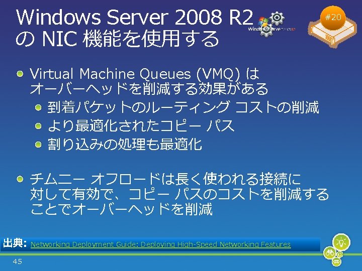 基本 4 リソース #1 パフォーマンスの基礎情報 Processor (*) % Processor Time> 75% MemoryAvailable MBytes <100 MBs Logical. Disk (*) Avg Disk sec/Read|Write> 15 ms Network Interface (*) Output Queue Length> 2 19