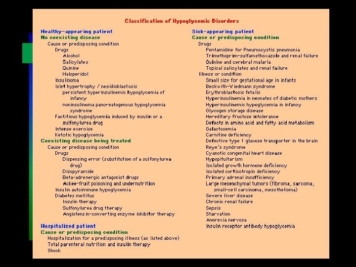 Clinical Classification of Hypoglycemia Fasting Hypoglycemia Drugs Insulin, sulfonylureas, alcohol, Pentamidine, quinine Salicylates, sulfonamides Critical illnesses Hepatic failure Cardiac failure Renal failure Sepsis Hormonal deficiencies Cortisol or growth hormone, or both Glucagon and epinephrine Non-beta cell tumors Endogenous hyperisulinism Pancreatic beta cell disorders Tumor(insulinoma) Nontumor Beta cell secretagogue Autoimmune hypoglycemia Insulin antibodies Insulin receptor antibodies ?Bate cell antibodies ?Ectopic Insulin secretion Hypoglycemias of infancy and childhood Reactive Hypoglycemia Congenital deficiencies of enzymes of carbohydrate metabolism Alimentary hypoglycemia Idiopathic(functional) postprandial hypoglycemia