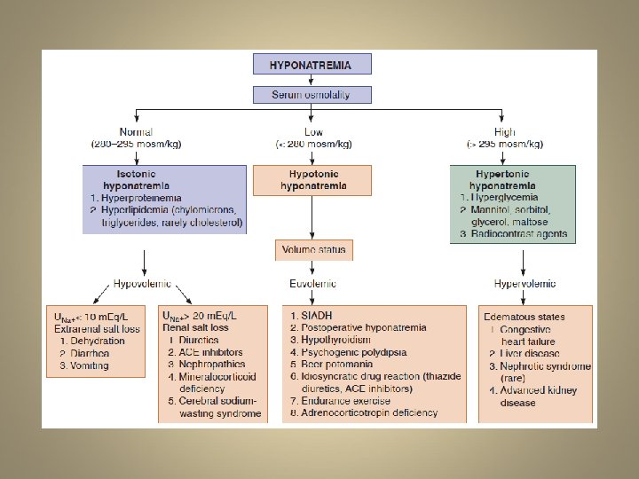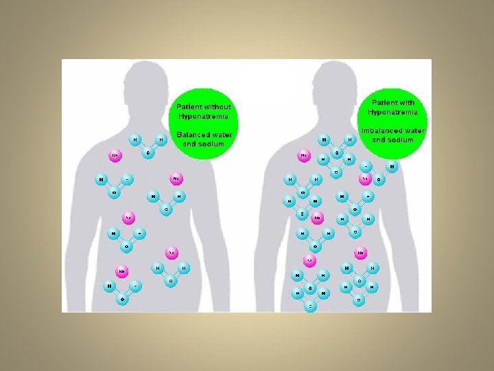 Hypovolemic hyponatremia • Decreased total body water and total body sodium (sodium more decreased than water). • Symptoms and signs resemble those in dehydration: prolonged skin turgor, dark urine, loss of body weight, tiredness, headache • develops as sodium and free water are lost and/or replaced by inappropriately hypotonic fluids • Sodium can be lost through renal or non-renal routes www. grouptrails. com/. . . /0 -Beat-Dehydration. jpg