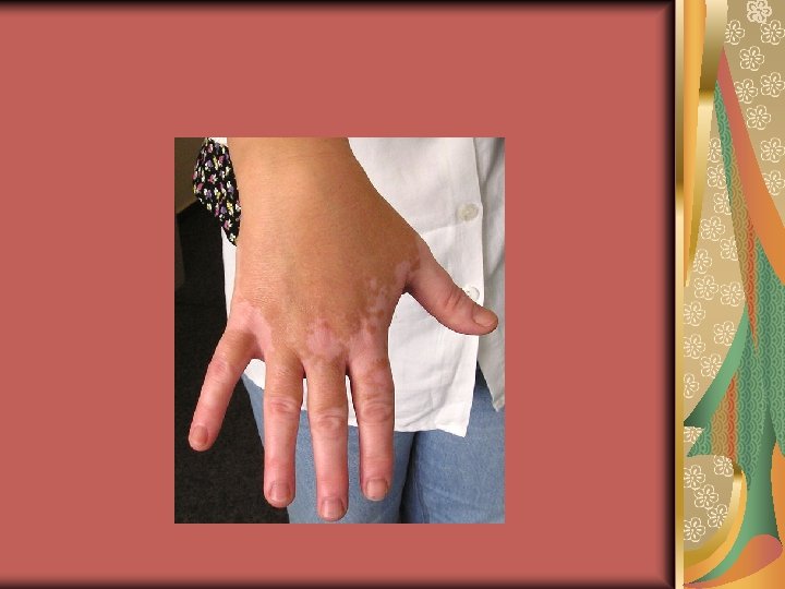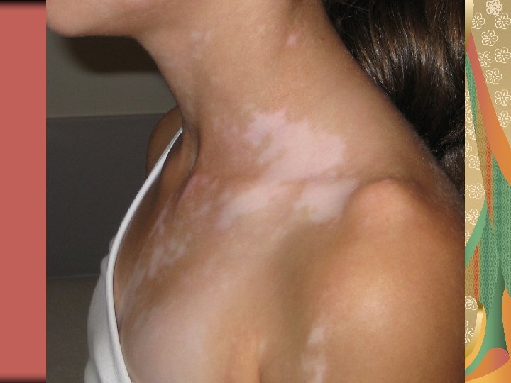 Physical examination “Chalk” or pale white, sharply marginated macules, 5 mm to 5 cm or more in diameter Focal type, segmental type, generalized Around the eyes, mouth, digits, elbows, knees, low back, genital areas Associated cutaneous findings: White hair (poliosis), prematurely gray hair, alopecia areata, halo nevi. General examination: Up to 30% of cases associated with thyroid disease (Hashimoto thyroiditis, Graves’ disease); diabeytes mellitus (< 5%); pernicious anemia; Addison’disease( uncommon), MEN (rare).
