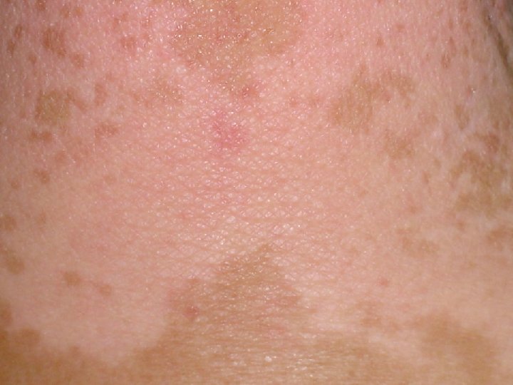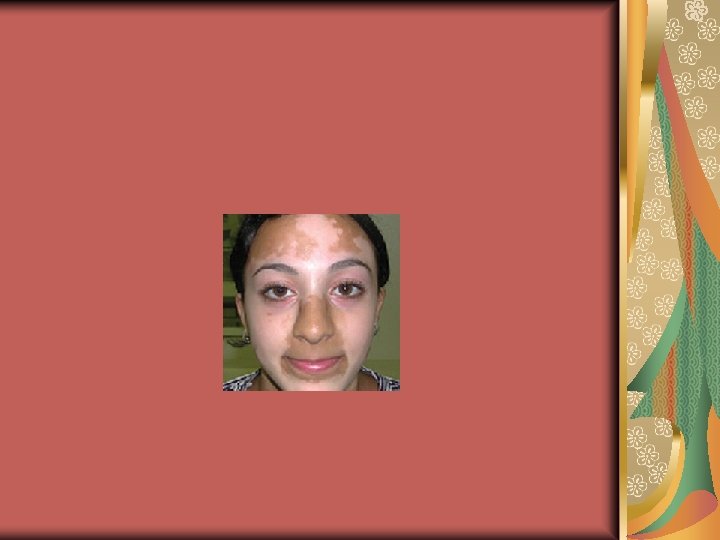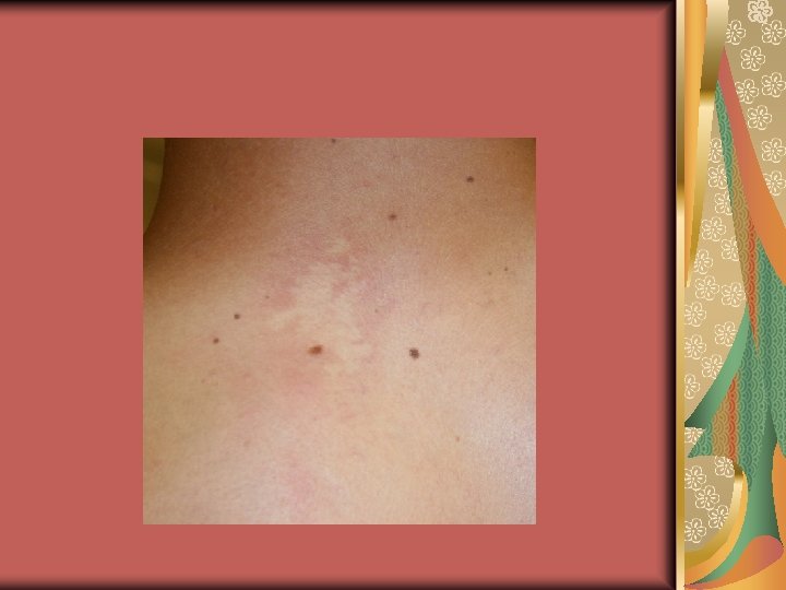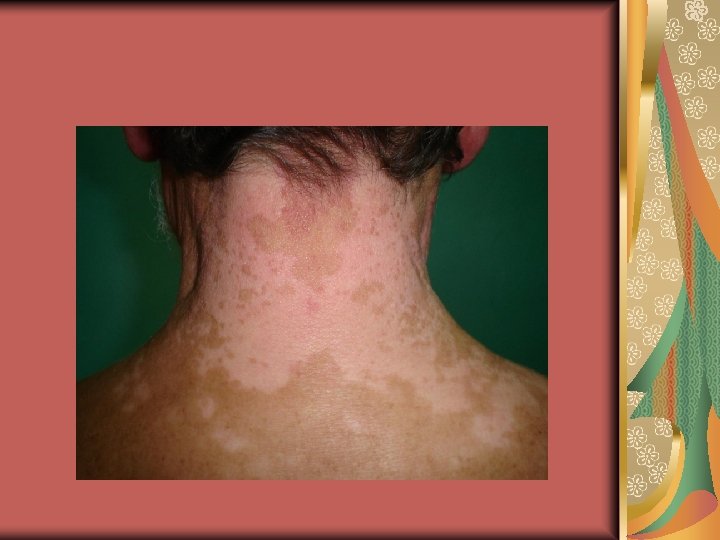 Differential diagnosis (1) Oculocutaneous albinism Fenilketonüri, homosistinüri, histidinemi (AR) Selenium and copper deficiency Pityriasis alba Pityriasis versicolor Chemical leukoderma (phenolic germicides) Leprosy Nevus depigmentosus (congenital, nonprogressif, stable in size, normal or decreased number of melanocytesdecrease in the synthesis and transfer of melanosomes, trunk, proximal extremities, isolated, segmental or systematized ( unilateral whorls and streaks) Nevus anemicus Secondary syphilis