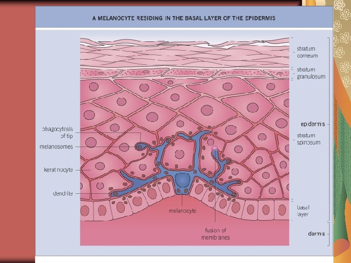 Pigment cell biology Melanocytes: Pigment-producing dendritic cells of the skin, originated from the neural crest from where they migrate during embryogenesis; located mainly in the basal layer of the epidermis and the matrix of the hair follicle Melanosomes: Specific organelles in the cytoplasm of the melanocytes, where melanin is deposited As the melanosomes mature and acquire melanin, they move to a perinuclear position into the dendrites. Each melanocyte interconnects with 36 keratinocytes. These surronding keratinocytes phagocytize the tips of the melanosome-containing dendrites and transfer the pigment!!→→ normal skin pigmentation