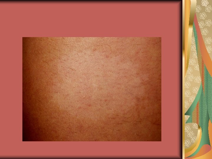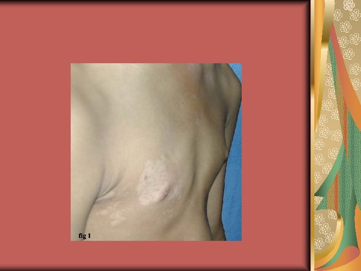 Differential diagnosis (3) Post-inflammatory leukoderma Menkes syndrome (X-linked recessif, inappropriate intracellular copper storage, pili torti, CNS involvement) Hypopigmented Mycosis Fungoides Vogt-Koyanagi-Harada Syndrome ( uveitis, vision problems, photophobia, bilateral dysacusia, CNS involvement, sensorineural hearing loss) Hypomelanosis of ITO: normal or decreased number of melanocytes and melanosomes, decreased melanin , neurocutaneous syndrome, whorled and streaked, linear lesions following the lines of Blaschko, trunk and extremities, at birth, during infancy or childhood, alopecia, teeth alterations, neurologic, musculuskletal, cardiac and ocular abnormalities