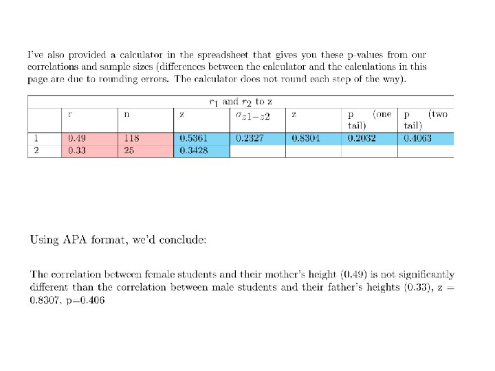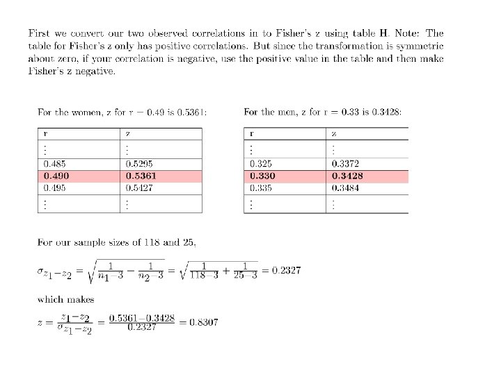 2) Testing the null hypothesis that two independently sampled correlations are the same. The sampling distribution of correlations becomes more and more skewed when the correlation of the population gets closer to 1 or -1. So comparing whether two correlations are different requires a more complicated conversion. Comparing two correlation values is done by first converting from r to Fisher’s z and then conducting a z-test where The spreadsheet provides Table H for converting from sample correlations r to z’ so you don’t have to use the formula. I’ve provided a version of table H along with a calculator in excel which you can download.