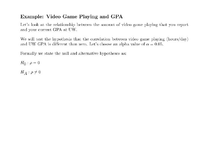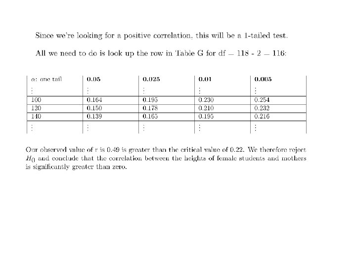 1) Testing the null hypothesis that a single correlation is equal to zero. The sampling distribution for r is very complicated and can be strongly skewed. However, for testing whether a sample is being drawn from a population with zero correlation, Ronald Fisher figured out an easy way to convert a sample correlation from r to t, so we can run a standard t-test: Using df = n-2, where n is the number of pairs in the correlation. I make it even easier by giving you Table G that provides critical values of r for values of a and df. We don’t have to convert from r to t, just look up the critical value for r in table G.