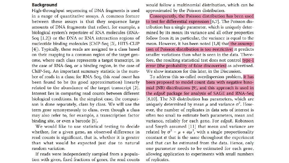 Questions: How to estimate a relatively true expression value for each gene? How to identify significantly differential expressed genes across samples? Difficulties: How to reduce type-I error? How to control gene expression over-dispersion? How to deal with low/0 number of replicates?