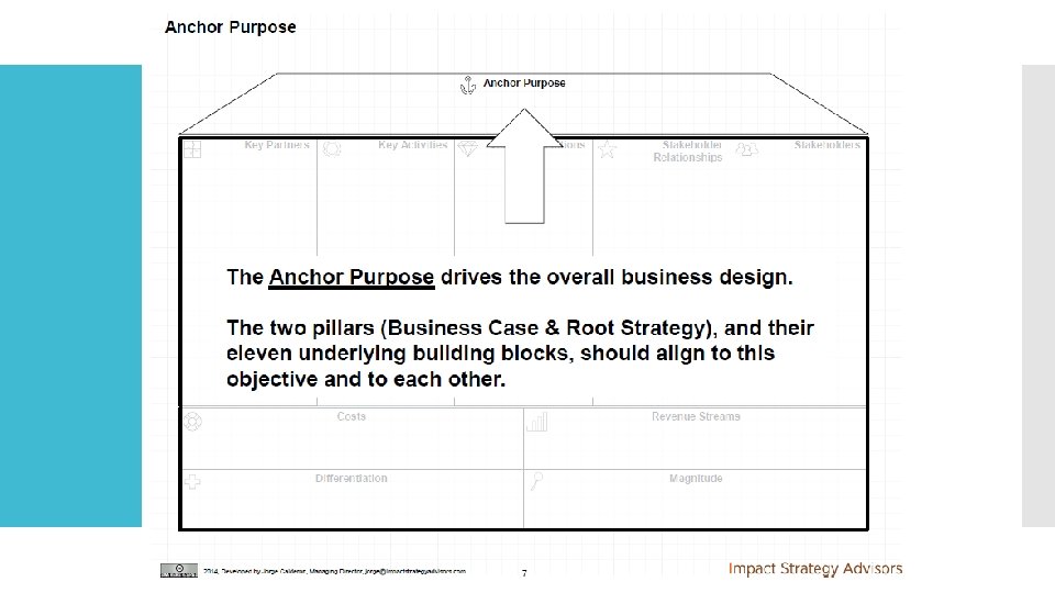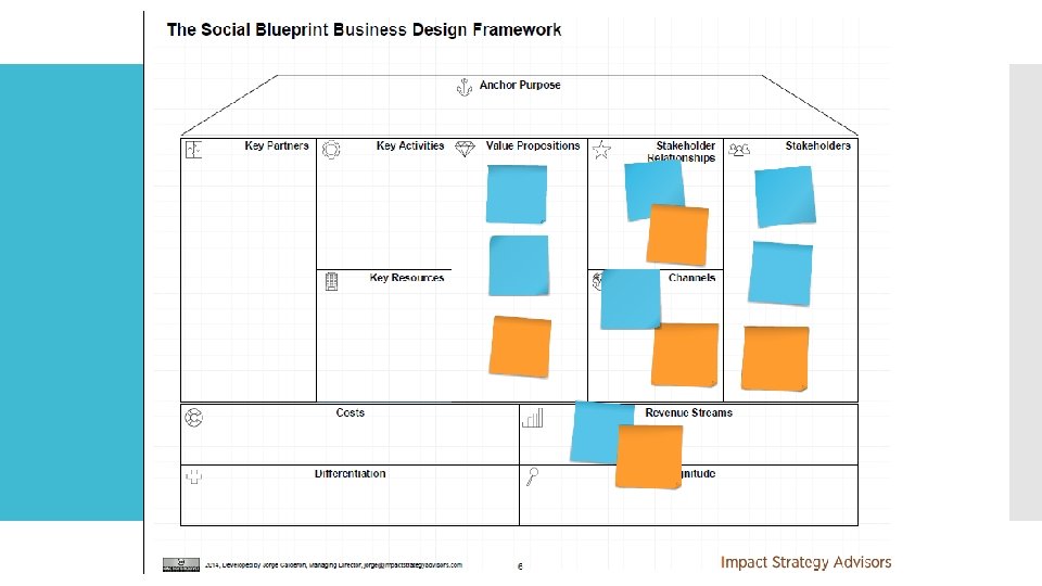 Revenue Streams The cash a company generates from each Customer. There may be different revenue streams for different Customer Segments. • Each revenue stream may have different pricing mechanisms. Magnitude The size and depth of the addressable social and economic opportunity for customers, stakeholders, and society. • This is based on data and will influence the scale of the intended value propositions, the channel strategy, and the profit. Proof? Source: Business Model Generation / Impact Strategy Advisors