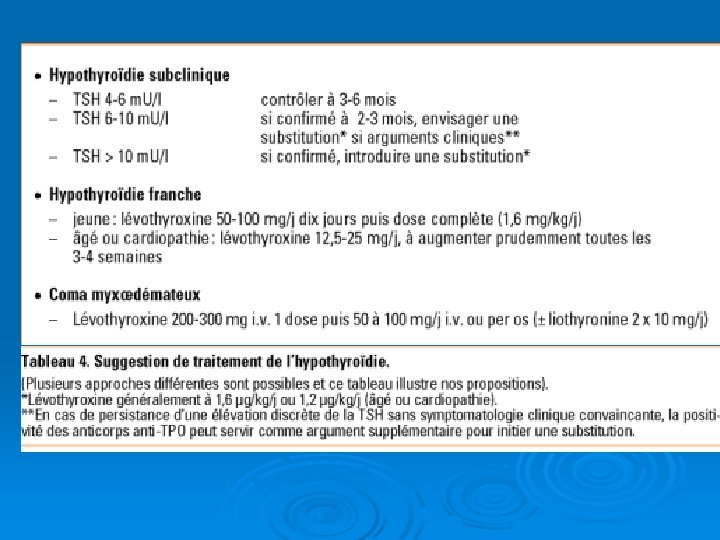 L'hypothyroïdie est une maladie fréquente que l'on diagnostique souvent, de nos jours, à un stade précoce. Ø Une substitution par lévothyroxine aura comme objectif principal d'améliorer la qualité de vie. Ø La simplicité du dépistage en cas de symptomatologie évocatrice et la facilité du traitement substitutif ne doivent pas occulter les incertitudes concernant, notamment, l'utilité d'une substitution dans les formes subcliniques. Ø