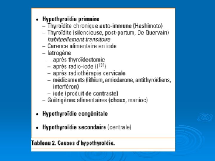 6. 2. 2/Autres médicaments inducteurs d’hypothyroïdie: Ø Outre les antithyroïdiens de synthèse, d’autres médicaments sont susceptibles de provoquer une hypothyroïdie: le lithium, les cytokines, les anti-tuberculeux, les sulfamides hypoglycémiants ou anti-infectieux… Ø L’hypothyroïdie induite par les médicaments mérite d’être dépistée chez des sujets à risque porteurs d’un goitre ou d’une anomalie de l’autoimmunité thyroïdienne.