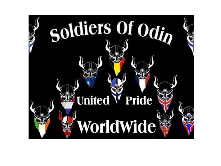Soldiers of Odin • Opprinnelig stiftet i Finland i september 2015 av Mika Ranta, en nynazist tilknyttet den Finske Motståndsrörelsen. • Spredte seg raskt til en rekke land, særlig i kjølvannet av nyttårshendelsene i Kölln. • Hevder å ha grupper i Finland, Sverige, Norge, Polen, Tyskland, Estland, Ungarn, Storbritannia, Malta, Canada, og USA, muligens også flere steder. • Grunnleggeren innførte Soldiers of Odin-logoen, etter forbilde fra outlaw MC-gjenger, og brukte tradisjonelle høyreekstreme og nasjonalistiske symboler.
