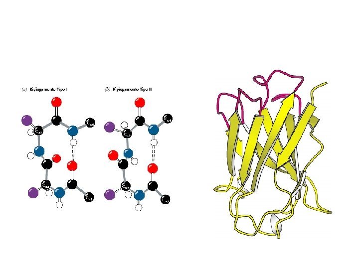 Foglietto β Forma più o meno piatta o pieghettato (ondeggiante) Quasi sempre una certa distorzione (avvolgimento) lungo l’asse delle catene Un foglietto β contiene da 2 a 12 catene (media intorno a 6) Ogni catena contiene fino a 15 aminoacidi (media 6)