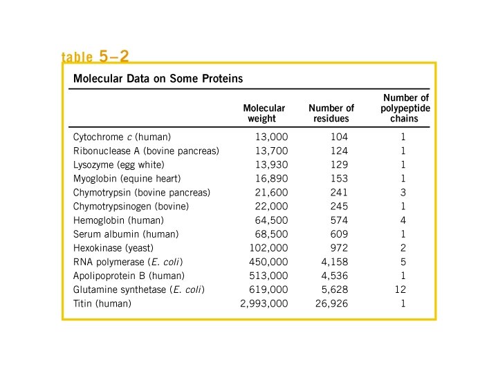 Proprietà degli aminoacidi presente nelle proteine p. Ka α-COOH Alanina 2. 3 Arginina 2. 2 Asparagina 2. 0 Acido aspartico 2. 1 Cisteina 1. 8 Glutamina 2. 2 Acido glutammico 2. 2 Glicina 2. 3 Istidina 1. 8 Isoleucina 2. 4 Lisina 2. 2 Metionina 2. 3 Fenilalanina 1. 8 Prolina 2. 0 Serina 2. 2 Treonina 2. 6 Triptofano 2. 4 Tirosina 2. 2 Valina 2. 3 p. Ka α-NH 3+ catena lat. 9. 7 9. 0 12. 5 8. 8 9. 8 3. 9 10. 8 8. 3 9. 1 9. 7 4. 2 9. 6 9. 2 6. 0 9. 7 9. 6 9. 0 10. 0 9. 2 9. 1 10. 6 9. 2 10. 4 9. 1 10. 1 9. 6 - massa (dalton) 71 156 114 115 103 128 129 57 137 113 128 131 147 97 87 101 186 163 99 frequenza (mol %) 9. 0 4. 7 4. 4 5. 5 2. 8 3. 9 6. 2 7. 5 2. 1 4. 6 7. 5 7. 0 1. 7 3. 5 4. 6 7. 1 6. 0 1. 1 3. 5 6. 9
