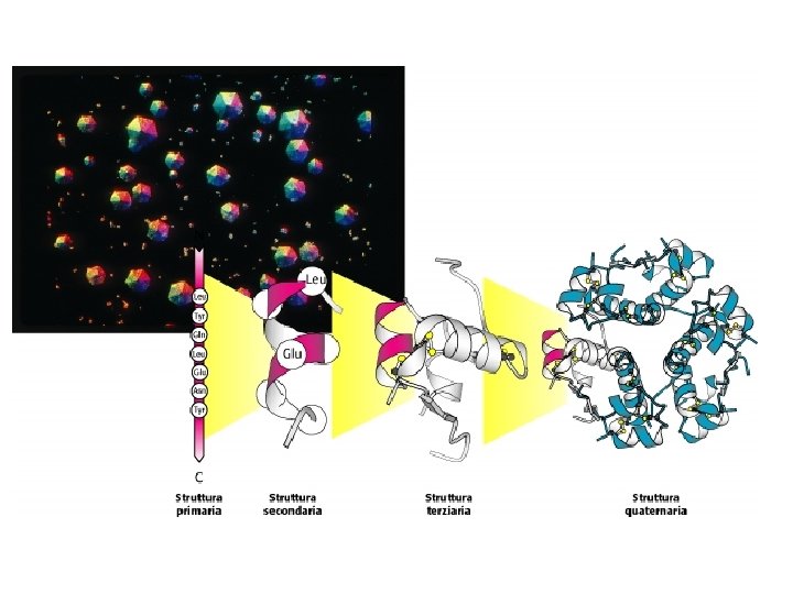 Struttura delle proteine: I quattro livelli. La struttura Primaria: la sequenza degli aminoacidi (della catena lineare) Ogni proteina ha una sequenza unica e precisamente definita La struttura Secondaria: schemi regolari di ripiegamento della catena α-elica, foglietto β, etc. La struttura Terziaria: la struttura tridimensionale di un intero polipeptide Proteine composte da due o più polipeptidi (subunità): La struttura Quaternaria: la disposizione spaziale delle subunità