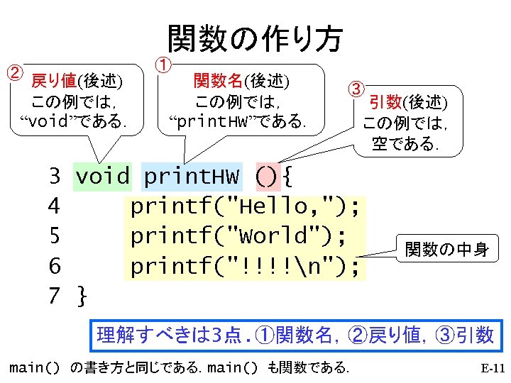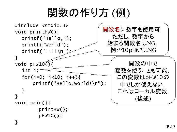 関数の動作 1/2 3 void print. HW(){ ⑨ 4 printf("Hello, "); 5 printf("World"); 6 printf("!!!!n"); 7⑩} 9 void main(){ 10 print. HW(); ⑦ printf("------n"); 11 ⑧ 12 print. HW(); ⑪ 13 printf("######n"); 14 print. HW(); 15 } E-9