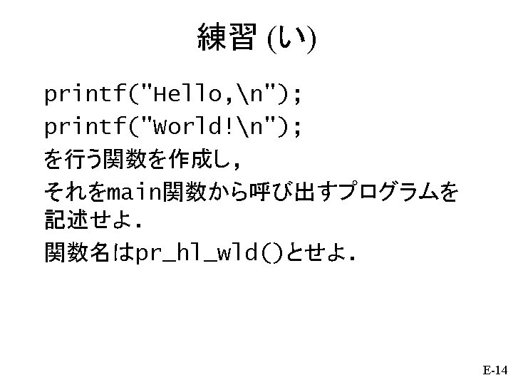 解答 (い) #include <stdio. h> void pr_hl_wld(){ printf("Hello, n"); printf("World!n"); } void main(){ pr_hl_wld(); } E-15