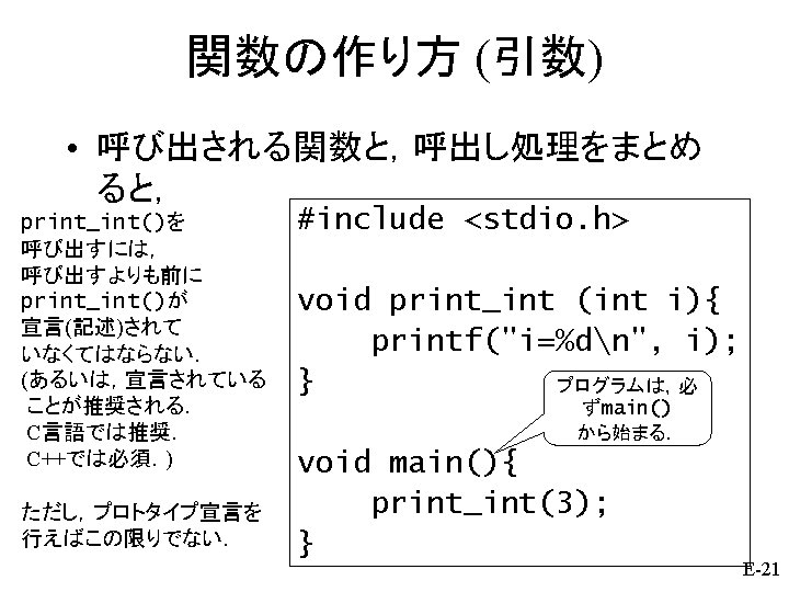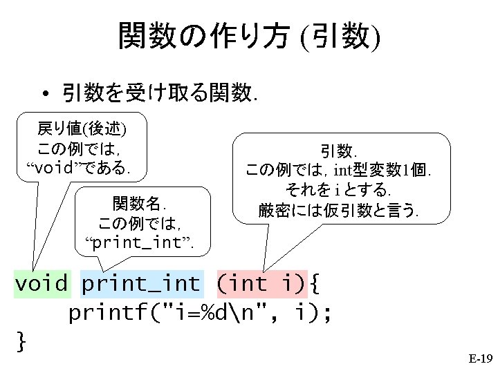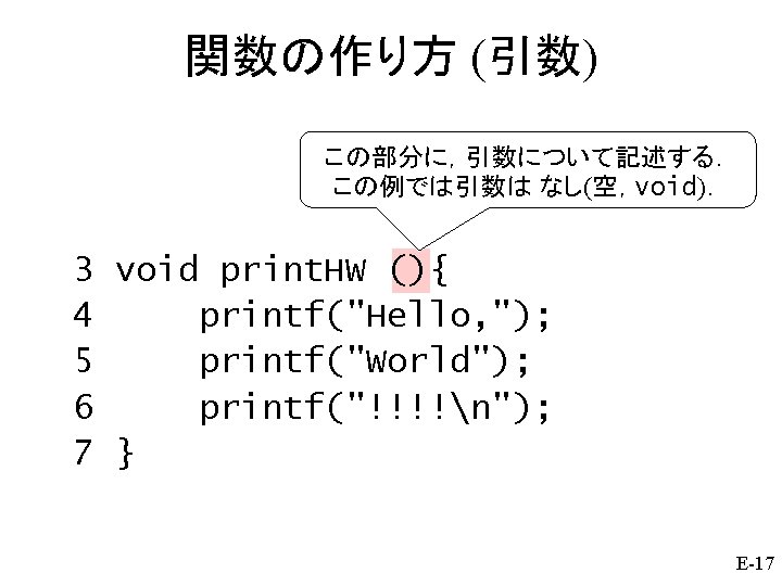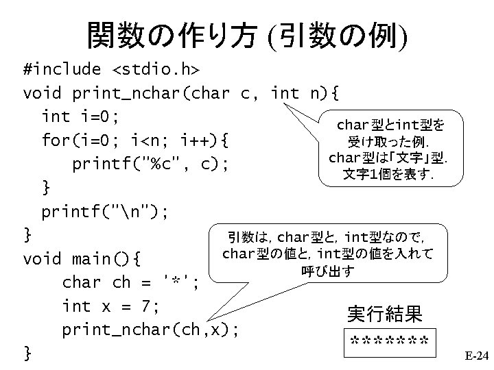 関数の作り方 (引数の例) #include <stdio. h> void print. HW_n(int n){ int i; printf("Hello, World"); for(i=0; i<n; i++){ printf("!"); } /* n個の ! を表示 */ printf("n"); } void main(){ print. HW_n(4); print. HW_n(7); } for文を使う例 実行結果 Hello, World!!!!!!! E-22