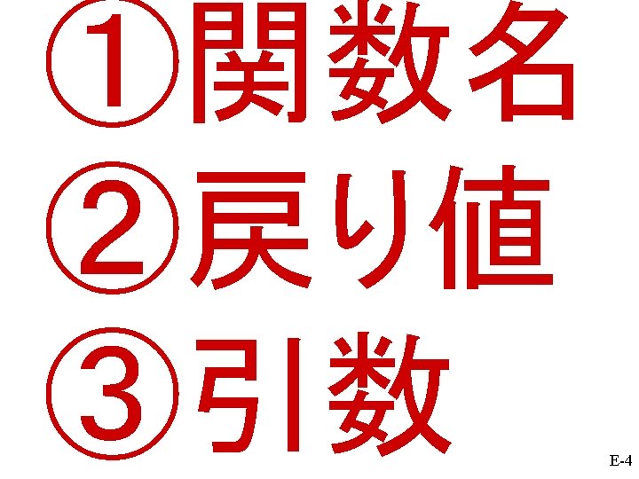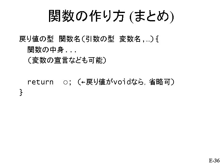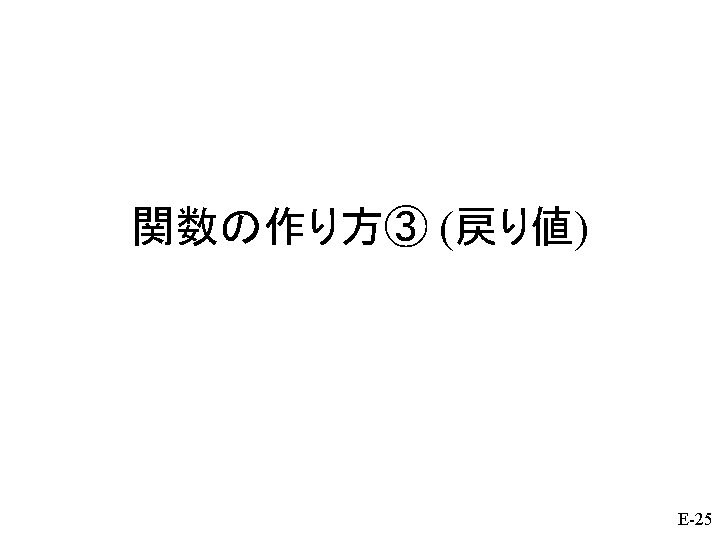 関数の作り方 (戻り値の例) 1 2 3 4 5 6 7 8 9 10 11 12 13 #include <stdio. h> int one(){ return 1; } int two(){ return 2; } int three(){ 実行結果 return 3; } i=1, j=2, k=3 void main(){ printf("i=%d, j=%d, k=%dn", one(), two(), three()); } printf()の中に直接記述してもOK. one() が"1",two()が"2"と思えば良い. E-34