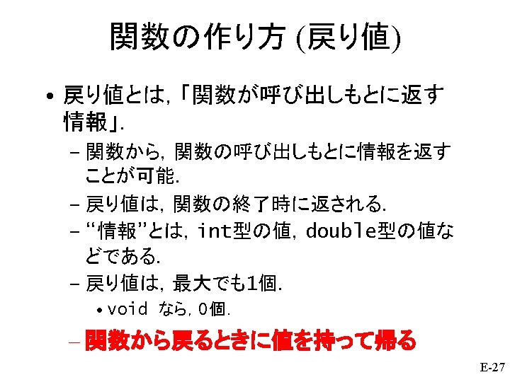 関数の作り方 (戻り値の例) 1 2 3 4 5 6 7 8 9 10 11 12 13 #include <stdio. h> double_square(double d){ 戻り値がdouble型なら, double sq; double型の値を sq = d*d; return する. printf("%lf^2 = %lfn", d, sq); return sq; } 実行結果 1. 500000^2 = 2. 250000 void main(){ square=2. 250000 double s; s = double_square(1. 5); printf("square=%lfn", s); } E-32