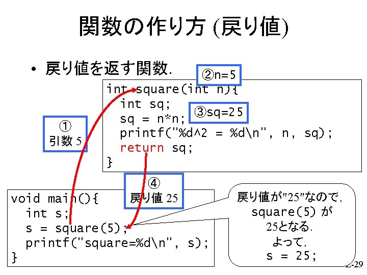 関数の作り方 (戻り値の例) 1 2 3 4 5 6 7 8 9 10 11 12 13 #include <stdio. h> int square(int n){ int sq; sq = n*n; printf("%d^2 = %dn", n, sq); return sq; } void main(){ int s; s = square(5); printf("square=%dn", s); } 実行結果 5^2 = 25 square=25 E-30