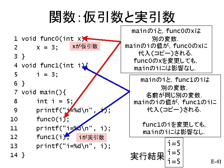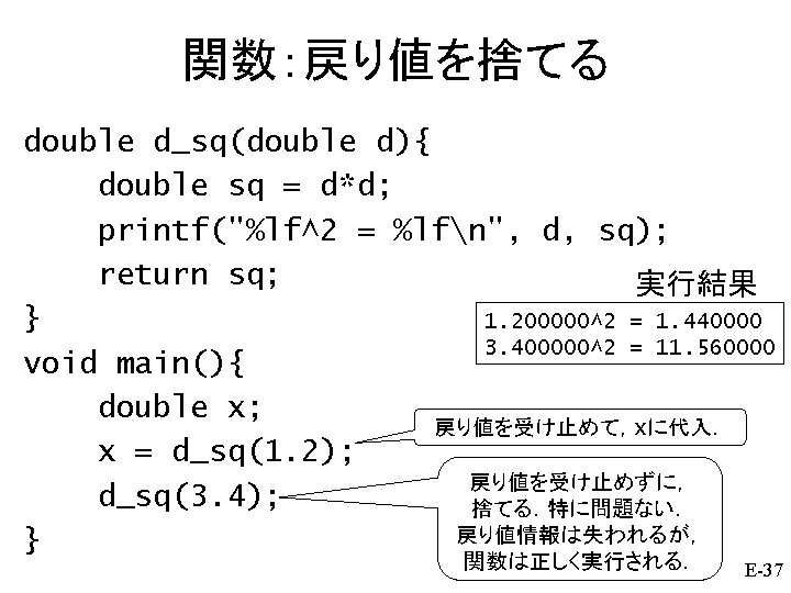 関数の作り方 (戻り値の例) 1 2 3 4 5 6 7 8 9 10 11 12 13 #include <stdio. h> double_square(double d){ 引数がdouble型1個なら, double sq; double型の値 1個を sq = d*d; 入れて,呼び出す. printf("%lf^2 = %lfn", d, sq); return sq; } 実行結果 1. 500000^2 = 2. 250000 void main(){ square=2. 250000 double s; s = double_square(1. 5); printf("square=%lfn", s); } E-31