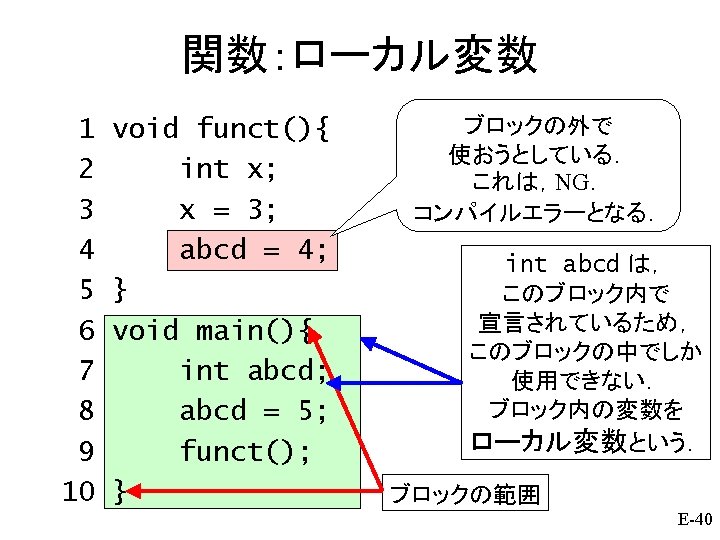 関数:return • return により, 関数は強制的に 終了する. 実行結果 AAAA BBBB 戻り値が無いときは, 単に return; と記述 1 2 3 4 5 6 7 8 9 10 11 12 #include <stdio. h> void funct(){ printf("AAAAn"); printf("BBBBn"); return; printf("CCCCn"); } void main(){ funct(); } E-39