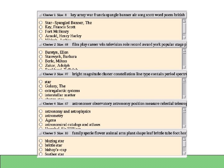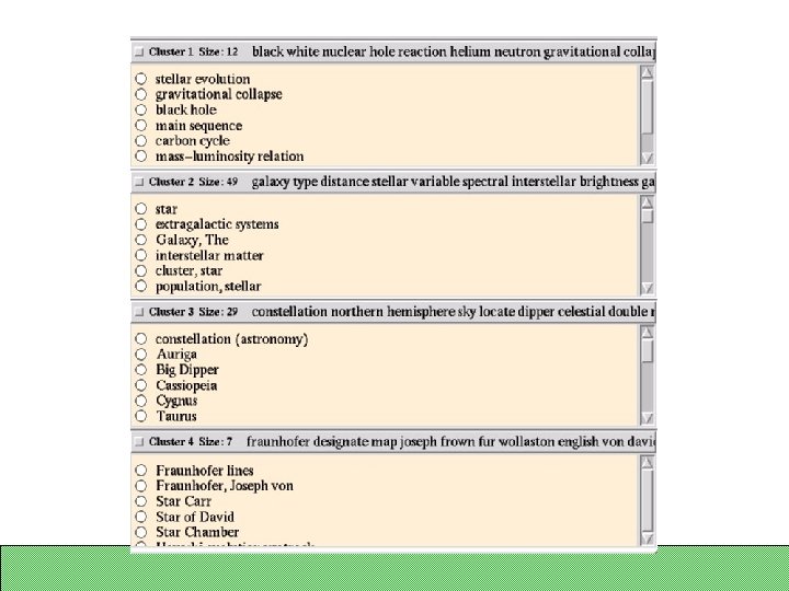 S/G Example: query on “star” Encyclopedia text 8 symbols 68 film, tv (p) 97 astrophysics 67 astronomy(p) 10 flora/fauna 14 sports 47 film, tv 7 music 12 steller phenomena 49 galaxies, stars 29 constellations 7 miscelleneous Clustering and re-clustering is entirely automated 26