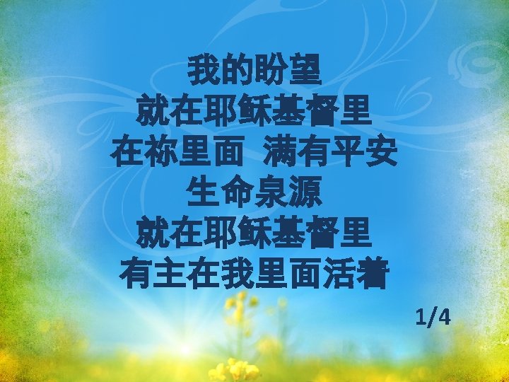 我的盼望就在耶稣基督里 All of my hope lies in Jesus Christ alone 在祢里面 满有平安 For I know that He is my peace 生命泉源就在耶稣基督里 All of my joy lies in Jesus Christ alone 有主在我里面活着 He lives in me forever more 1/6