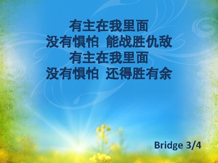 有主在我里面 My Lord who lives in me 没有惧怕 能战胜仇敌 Conquers all of my enemies 有主在我里面 My Lord who lives in me 没有惧怕 还得胜有余 is my portion, my victory Bridge 4/6