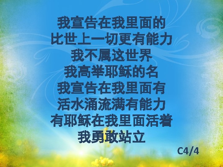 我宣告在我里面的 Declare, “the One who’s within me 比世上一切更有能力 is greater than the one in the world. ” 我不属这世界 I’m not of this world, 我高举耶稣的名 I belong to Jesus, the King. C 2/6
