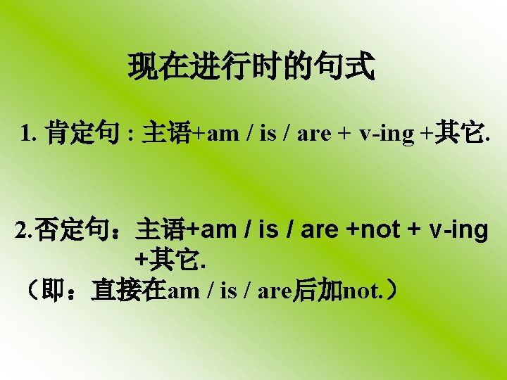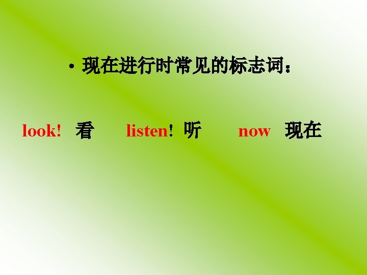 用所给动词的适当形式填空 is flying 1. Look! Andy____(fly) a model plane. is singing 2. Listen! Amy_____(sing) in the next room. are playing 3. Many students_______(play) football on the ground now. working (work). 4. Don’t make any noise, father is ____ is watching 5. It’s seven o’clock now. Mary _____(watch) TV.