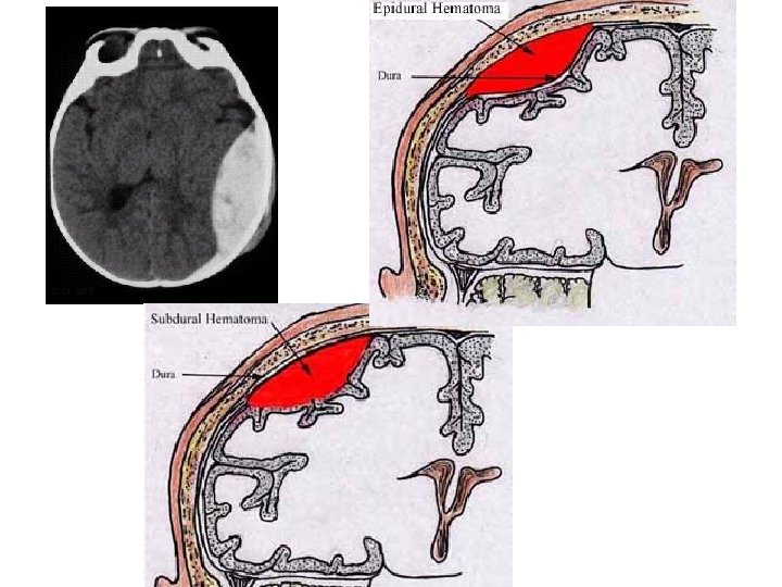 II. Injuries cont • 1) Epidural Hematoma- 1 st LOC then headache, vomitting, dilated pupils, etc • TX-immediate surgery • 2) Subdural Hematoma- Signs might not show up for days/weeks- slow bleed from vein fatal