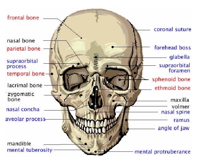 I Anatomy A) Bones of the Skull Maxilla- Top of mouth Mandible- Jaw Zygomatic- Cheek bone Tempomandibular Joint-TMJmandible to temple Nasal –top of nose