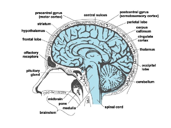 B) The brain- Encephalon Central Nervous System- brain and Spinal Cord 4 parts. Cerebrum~ thinking Cerebellum~ movement Pons~ Medulla Oblongata~ involuntary