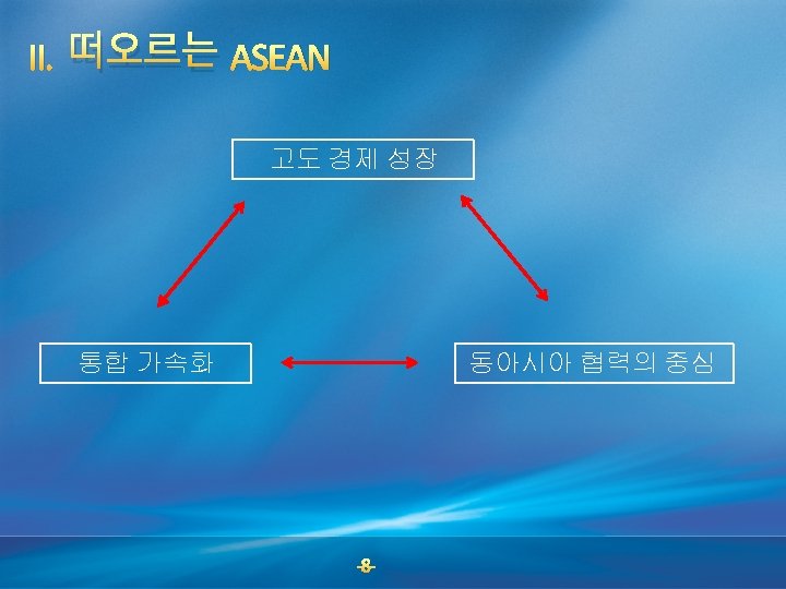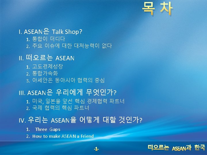 I. ASEAN은 Talk Shop? ASEAN WAY Great Diversity + ASEAN WAY 통합이 더디다 Durability + Pragmatism ASEAN+3 등 외연확대 주요 이슈에 대한 대처 능력이 없다 -2 -
