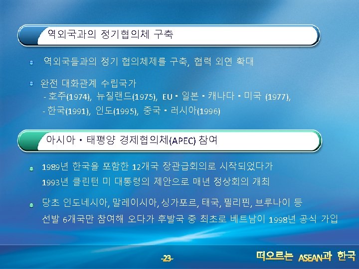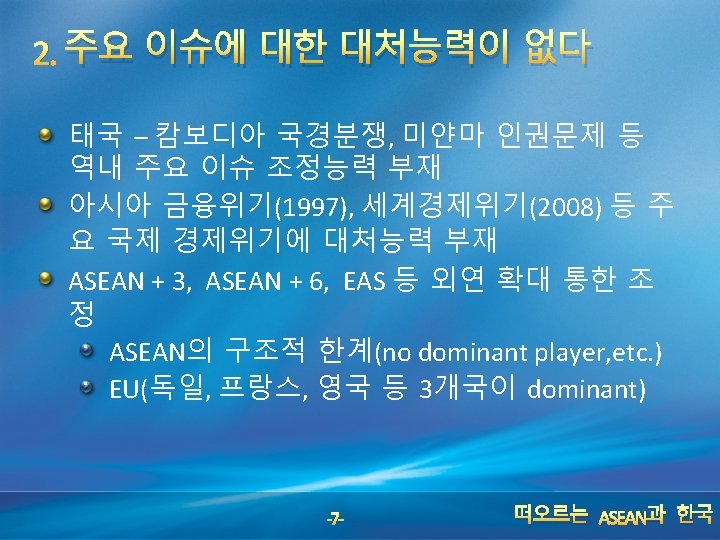 Durability and Pragmatism 개도국 그룹 중 가장 오래된 지역 기구(the most durable regional association in the developing world) - ASEAN : 1967, SADC : 1980 , Mercusor: 1991 peace and stability, harmony and understanding 점진적인 성장 1967 - 76 : 구체적 행동보다는 선언적 시기 1976 - 92 : Bali Summit – APTA, AIPS, etc. 1992 - 97 : AFTA – clear timetable, negative list 1997 - 2003 : 아시아 금융위기 – ASEAN + 3, more than trade 2003 - 현재 : AEC, ASEAN charter -6 - 떠오르는 ASEAN과 한국
